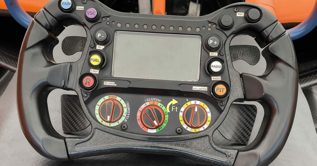 Sur le dashboard (l’écran) il y a beaucoup moins d’informations qu’en Formule 1. Une fois allumé, il affiche le rapport de boîte de vitesses engagé. Cet écran affiche également les températures d’huile et d’eau dans le moteur. Il y a également les tours par minutes du moteur (RPM) et le “lap time” qui affiche les temps au tour. L’écran affiche également les informations lors d’une VSC (Virtual Safety Car) avec le delta time.